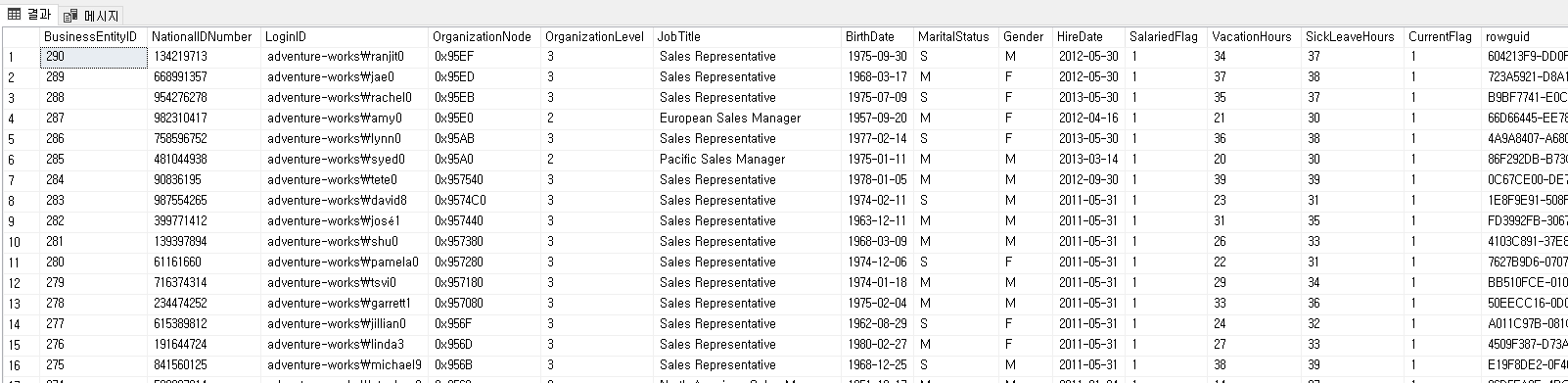 실행하게되면 [BusinessEntityID]가 25번인 사람만 보여주게되며 굳이 [BusinessEntityID]가 아니여도 다른명과 알고있는 데이터를 입력하면된다.